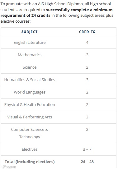 所有高中学生在四年内必须完成至少28个卡内基学分(Carnegie Credits)以及达到指定的社会服务要求(Community Service Hours)才能获取高中毕业文凭。美国国际学校是授认许的SAT考试中心,所有高中学生可以在校园内参加SAT I和SAT II考试。