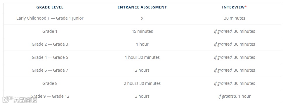 1至12年级申请人讲根据美国标准化考试进行入学评估,测试内容包括词汇、写作、阅读、理解、数学和口语能力;申请人还可能被要求写一篇关于指定主题的短文