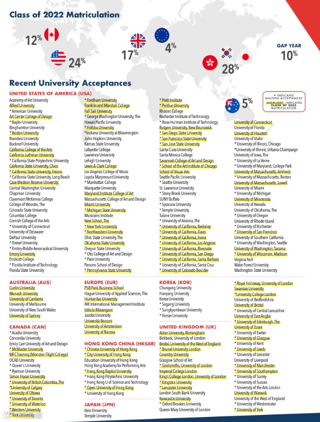 作为一所美式国际学校,香港美国国际的毕业生升学方向主要还是美国,去年有24%的学生被美国知名大学录取。其次是英国、加拿大、日本和中国香港的大学。学校2022年的录取表上看,该校的毕业生也不乏有宾夕法尼亚大学、加州大学伯克利分校、帕森斯设计学院、多伦多大学、香港大学、墨尔本大学等世界顶尖名校录取offer。