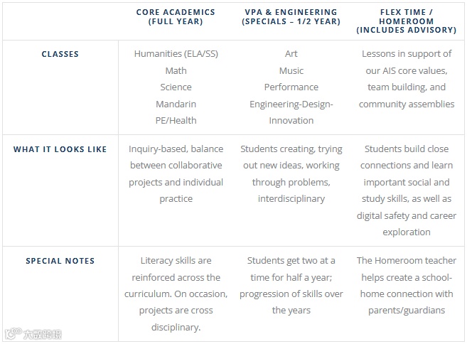 初中阶段,学生主要学习的课程是数学、科学、汉语以及人类学,主要是鼓励学生之间团队合作的能力和个人动手实操能力。学校高中采用美国大学先修课程(Advanced Placement,简称AP课程)进行教学,此课程获得美国国际知名评审协会——美国西部院校联盟(Western Association of Schools and Colleges,简称WASC)的权威认证,为学生申请美国顶尖名校打下最坚实的学术基础。