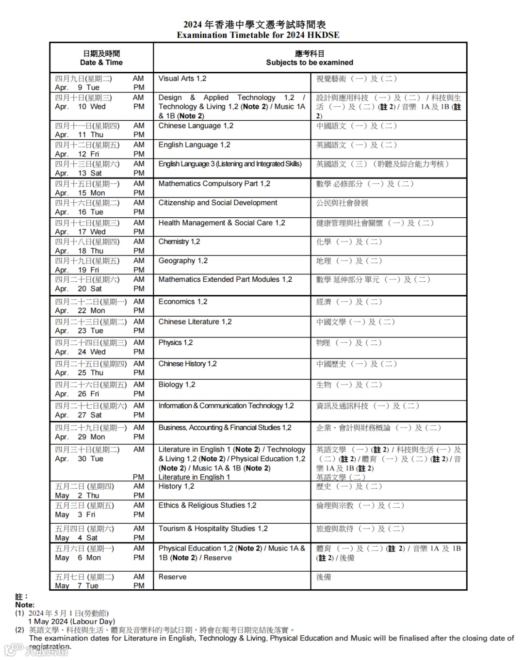 图:2024DSE考试时间表