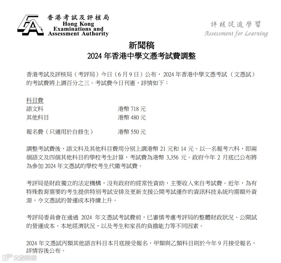 图:2024年香港中学文凭考试费调整原稿