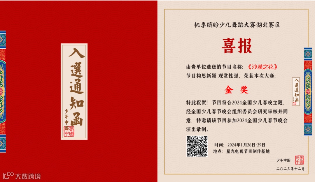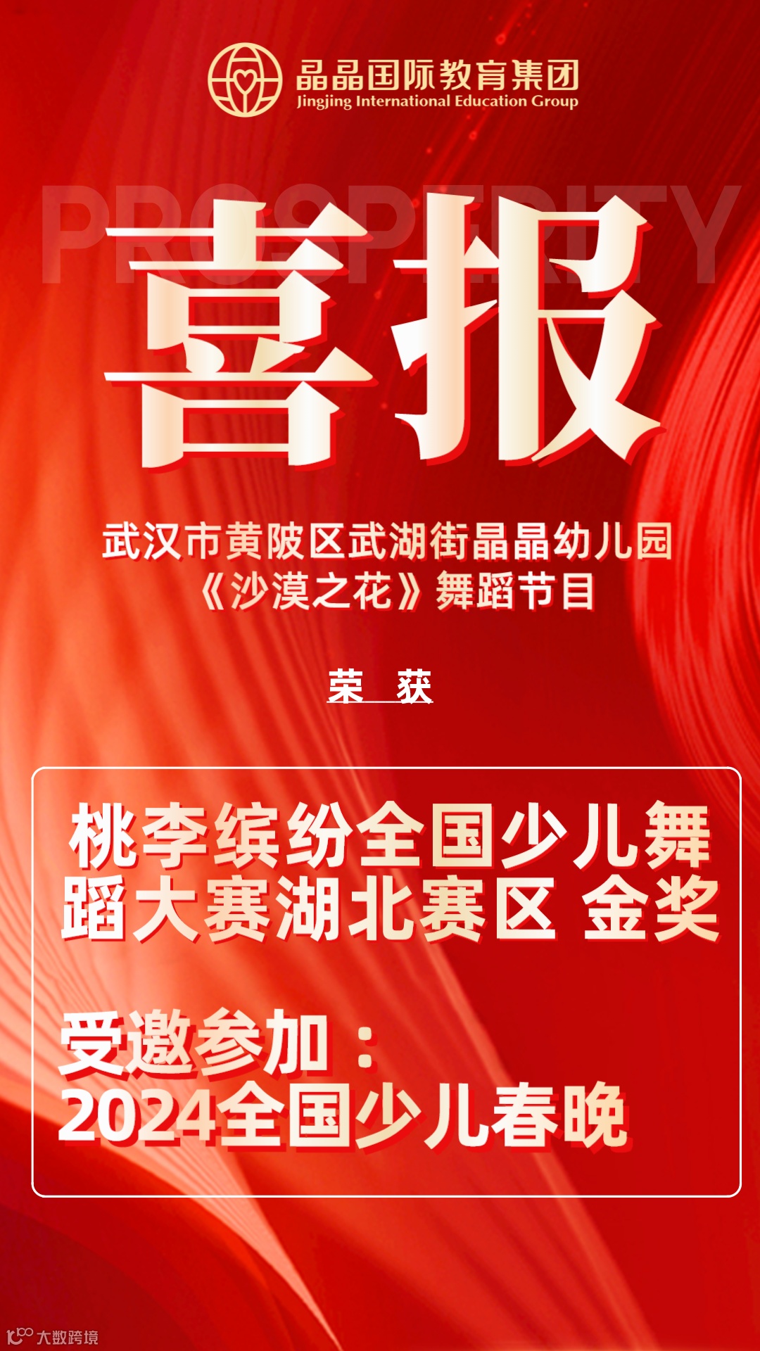 2023年12月23日,在桃李缤纷全国少儿舞蹈大赛湖北赛区中,晶晶国际教育集团武汉市黄陂区武湖街晶晶幼儿园的节目《沙漠之花》过关斩将荣获金奖,并受邀参加1月26日在北京举办的“2024年全国少儿春节晚会”演出。