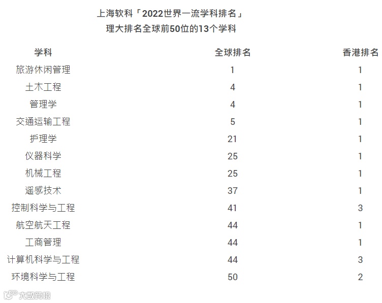 理大并在 11 个学科排名全港第一,包括旅游休闲管理、土木工程、管理学、交通运输工程、护理学、仪器科学、机械工程、遥感技术、航空航天工程、工商管理及社会学。