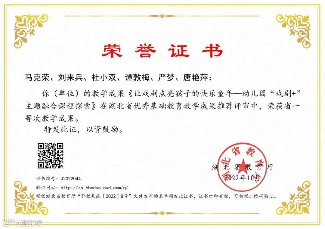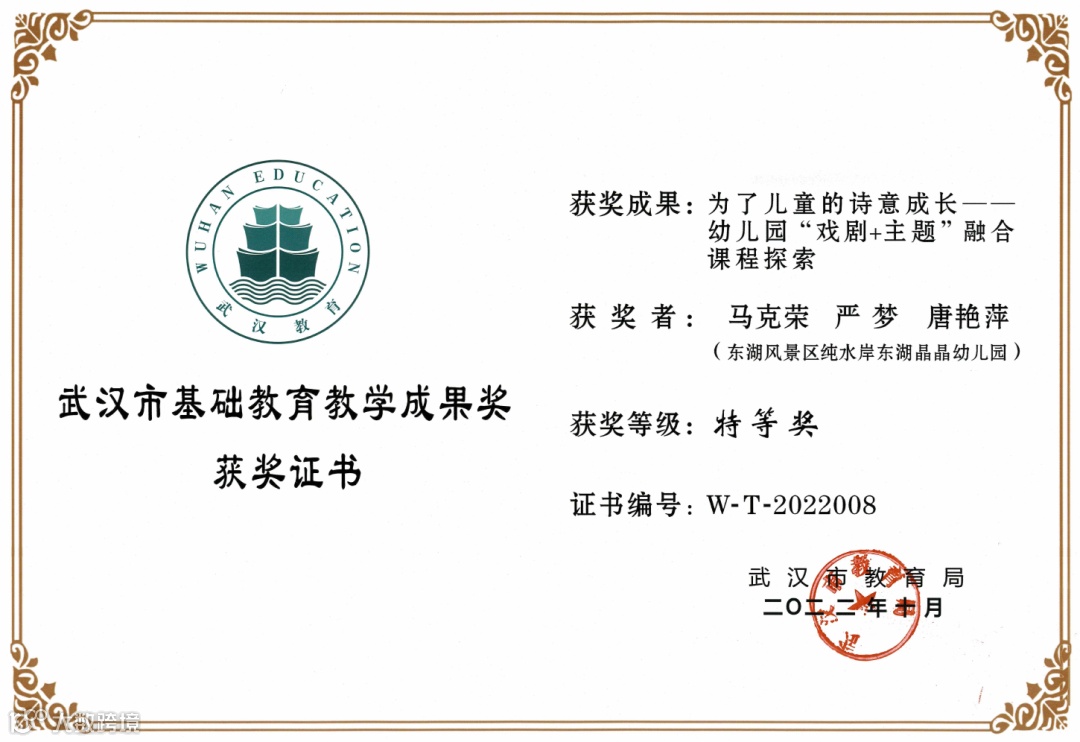 因为晶晶深厚的文化沉淀,2022年在学前艺术教育课程改革上取得重大突破,作为杰出代表,晶晶幼儿园“让戏剧点亮孩子的快乐童年——幼儿园‘戏剧+’主题融合课程探索”分别荣获基础教育成果奖湖北省一等奖和武汉市特等奖,成果现已被湖北省教育厅推荐参评国家级基础教育成果奖。
