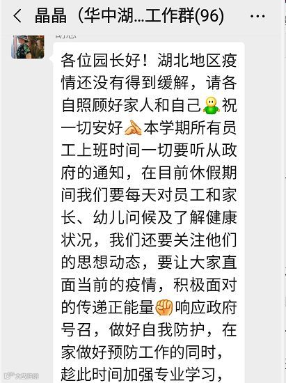 继前期集团总部三次线上工作会议之后,2月3日华中区正式成立重疫情区防控小组,定期召开会议部署工作,明确教学、后勤保障各方面的重点工作与安排,并每天反馈疫情情况,同时关注孩子、家长及员工的情绪。