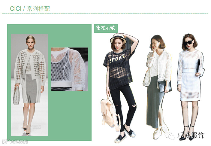 本季cici设计师运用透视面料将轻若无物的感觉加上简约的轮廓,实穿又营造出真正的商业价值面料趋势,透视的面料成夏季叠穿的关键。