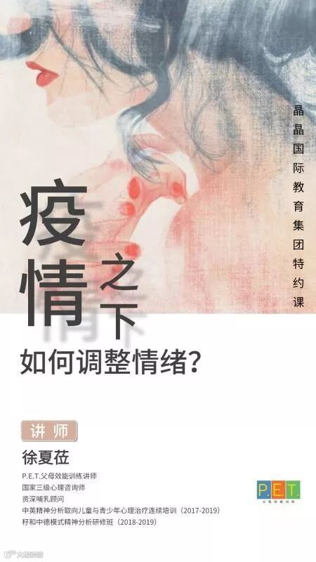 考虑疫情之下,长时间的居家相处可能会对家长与孩子们造成压力,晶晶特邀心理专家开设课程:疫情之下,如何调整情绪?面向所有家庭开放,旨在帮助大家疏导负面情绪,营造良好的家庭氛围,帮助孩子更好地发展。