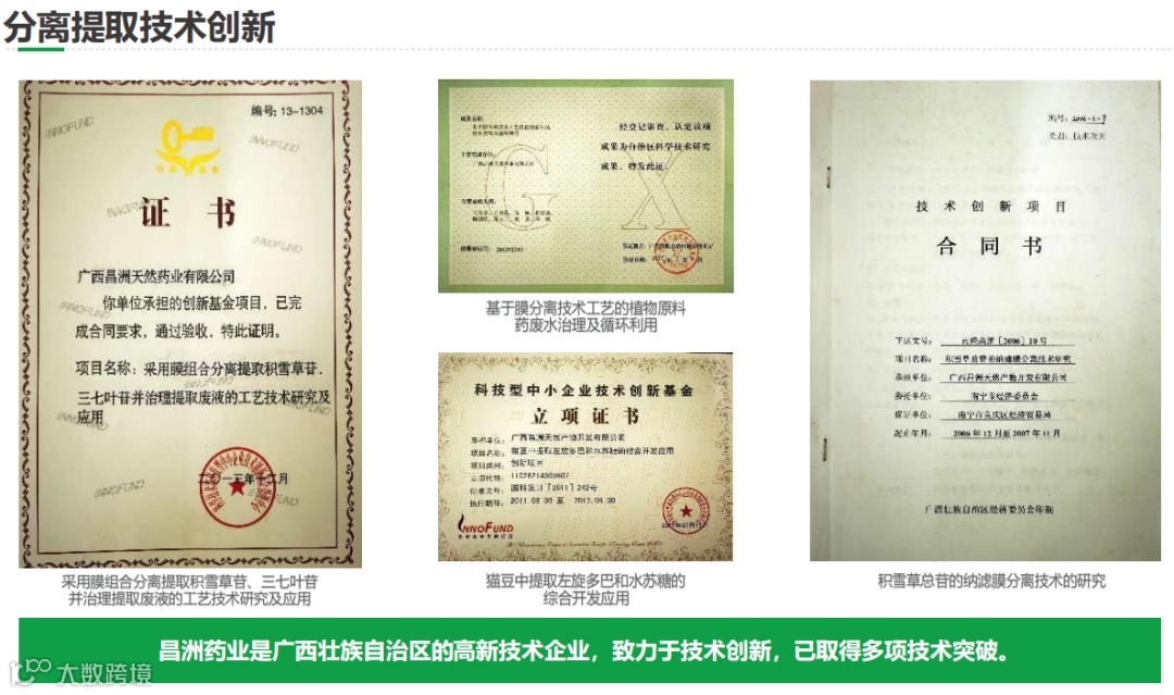 广西昌洲天然药业有限公司(简称“昌洲药业”)成立于1994年,是一家专业从事积雪草提取物等植物原料研发、生产和销售于一体的源头技术企业。目前拥有国内先进的植物提取物GMP生产线,配备提取、分离、精制等现代化设备100多台套,年投料量超3000吨,年产值规模近两亿元。