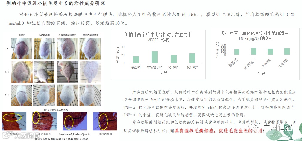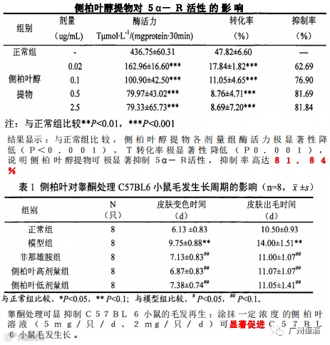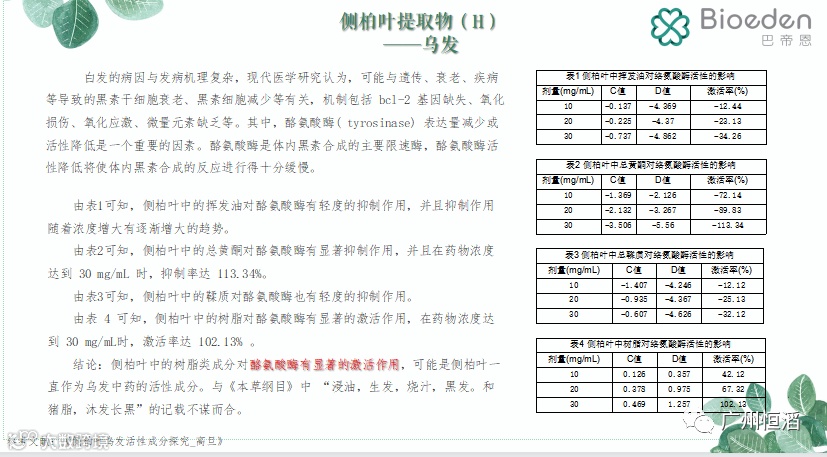 侧柏叶中的树脂类成分对酪氨酸酶有显著的激活作用,可能是侧柏叶一直作为乌发中药的活性成分。与《本草纲目》中 “浸油,生发,烧汁,黑发。和猪脂,沐发长黑”的记载不谋而合。