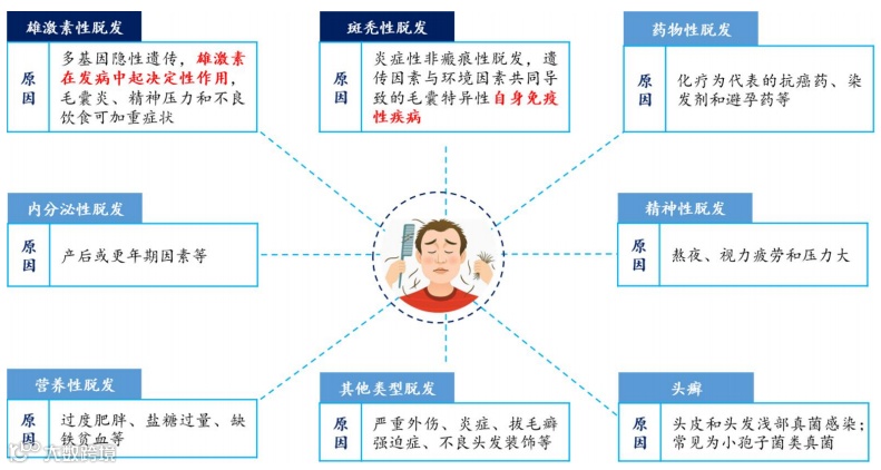 雄激素脱发(AGA)又名为脂溢性脱发,它的发生与5a-还原酶,睾酮(T)及其代谢产物二氢睾酮(DHT)和雄激素受体(AR)的水平增高直接相关。