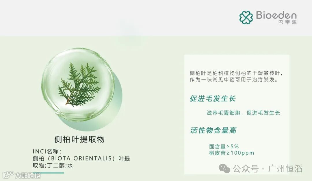 巴帝恩生发利器--侧柏叶提取物,有生发、护发、抗炎等功效。极显著抑制5α-还原酶活性,抑制二氢睾酮(DHT)形成,抑制率高达81.84%,从根本原因上解决脂溢性脱发问题;能够显著抑制NO,IL-6,IL-1β及TNF-α含量,抑制细胞炎症,发挥了良好的体外抗炎效果;滋养毛囊细胞,促进毛发生长。