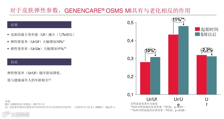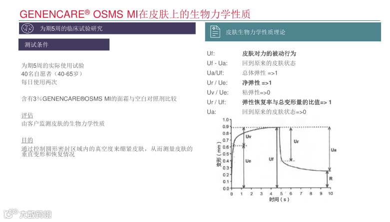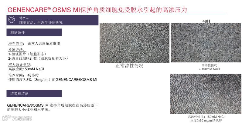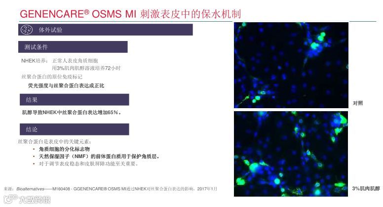 GENENCARE® OSMS MI是一种强效的渗透防护剂,控制活细胞中的水分平衡,也是一种长效皮肤保湿霜,能增强丝聚蛋白作用。此外,该产品还可参与多种细胞生物进程,改善皮肤成纤维细胞的新陈代谢,从而提高皮肤肌肉弹性。