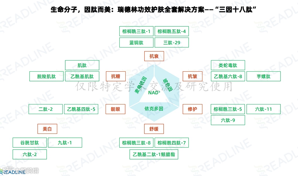 作为绿色活性原料的引领者,瑞德林“三因十八肽”护肤方案涵盖美白、抗衰、抗皱、修护、抗糖、舒缓、亮眼等多种功效,为客户建立功效护肤全套解决方案,高效解决肌肤问题。