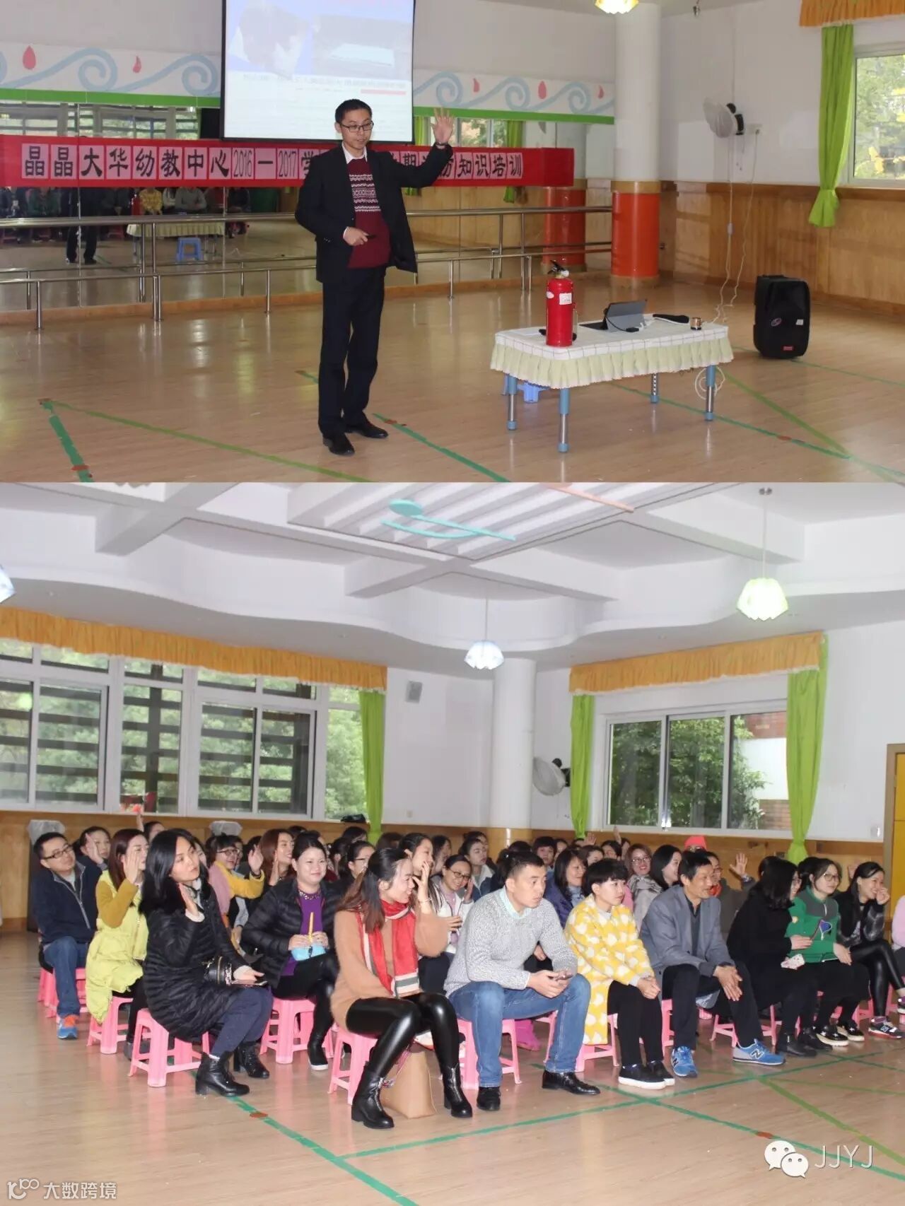 活动前李教官对大华幼儿园的教职员工们、家长委员会代表们进行了一次消防安全知识培训。培训涉及基本消防知识、消防逃生器械使用方法、火场自救逃生方法、火灾逃生需注意的安全事项等内容。