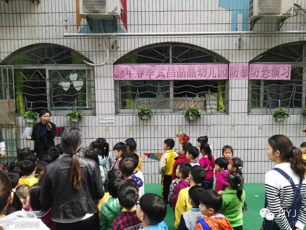 为了有效预防幼儿园暴力事件的发生,及时处置危及师生安全的各类事件,维护幼儿园正常的教育教学秩序,华中区武昌晶晶幼儿园于2016年4月7日开展了一次“坏人来了”的防恐防暴演练活动。上午10:00,一名戴黑色帽子的“歹徒”,手持凶器强行闯入幼儿园,保安人员进行阻拦。随着一声警报声,正在操场进行户外活动的老师迅速带领幼儿回到安全的地方,远离危险地带。幼儿听从老师的指挥与安排,安静、有序的躲在隐秘的地方,等待着危险的解除。经过近4分钟的搏斗,大家将“歹徒”成功制服。这时,园长宣布警报解除。教师分班进行幼儿的心理疏导工作,耐心安慰受到惊吓的幼儿。