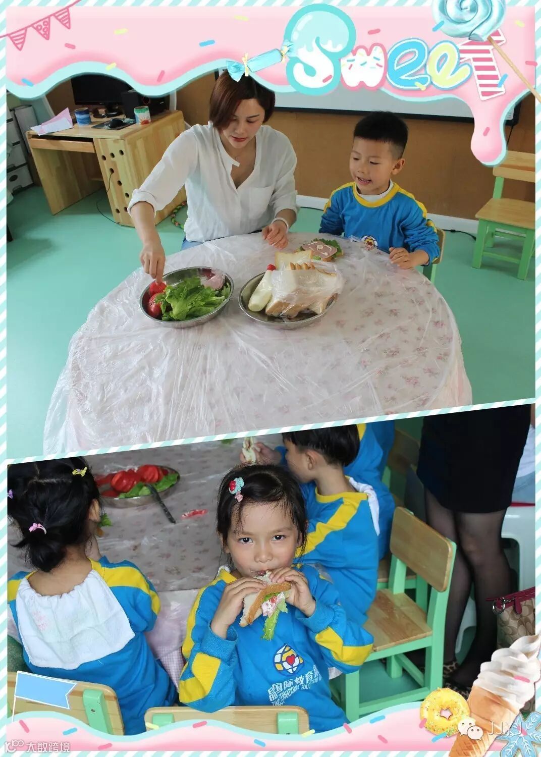 “亲子DIY饼干”、“三明治制作”、“水果萨拉”家长们从家里搬来了烤箱,准备了人手一份的制作需要的材料,在家长和孩子们一起捏饼干、制作三明治以及水果萨拉。
