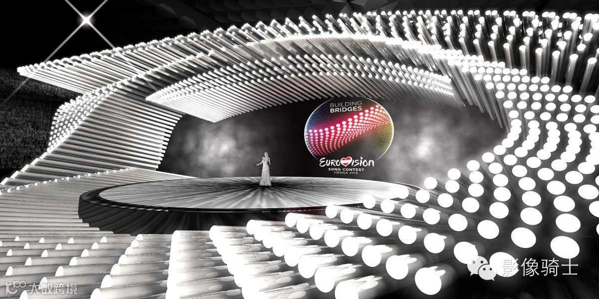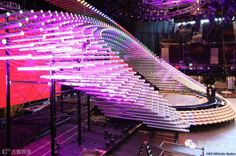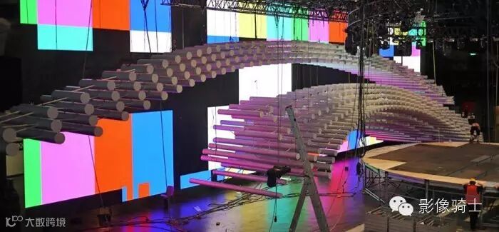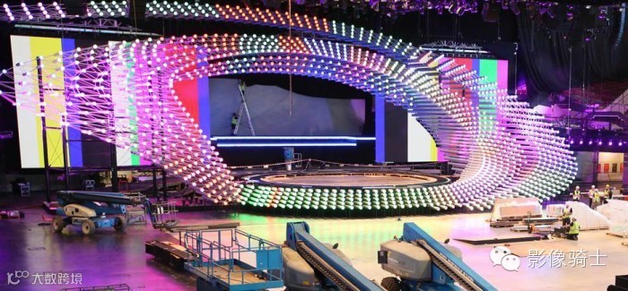 圆形舞台,1288管眼搭建已经完成,可以看出,在舞台上所有的led管亮了起来。同时,LED墙已经开通,以揭示其背后的空间。