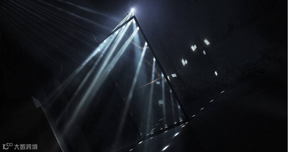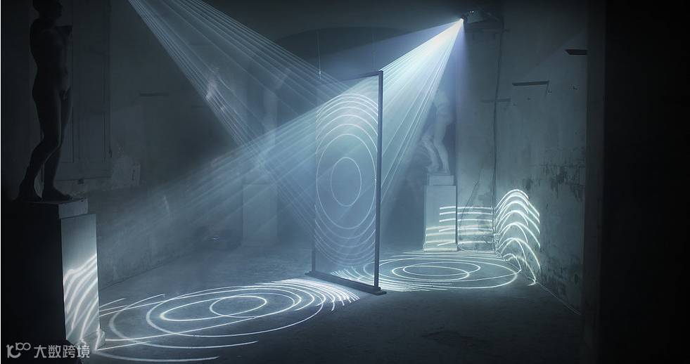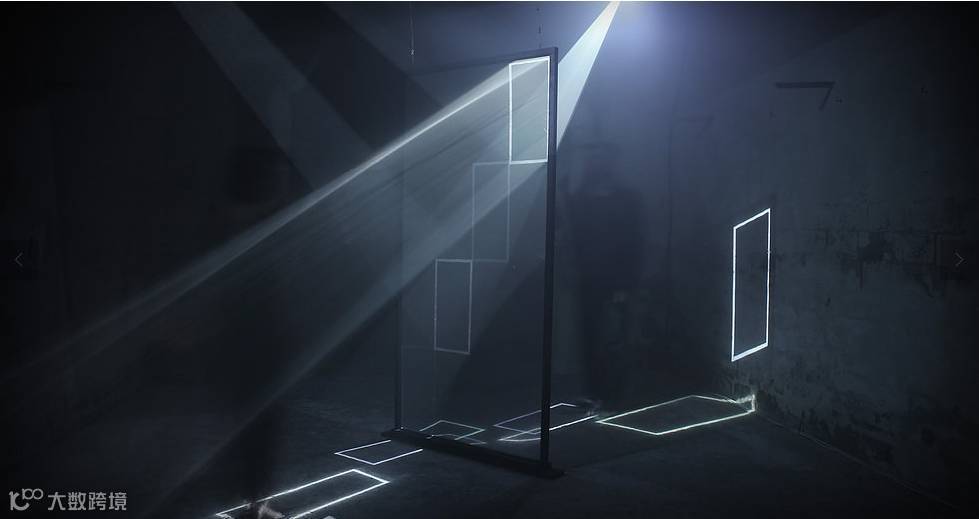 在视频中,一块反射屏被放置于昏暗的地下室中间,不同的图形投向屏幕表面,不停地浮现、变化,她通过投影图形在一块镜面反射屏上的映照、反射,使“两个平行空间中浮现了一扇窗” 。而灯光能在这个空间里有这么强的穿透力除了灯光本身的性质,空间里的烟雾也对灯光的穿透力起到了增强的作用。
