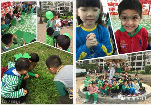 晶晶中城康桥幼儿园大一班,结合《3-6岁儿童学习与发展指南》以及《晶晶I CAN》课程,“以爱的教育为灵魂”的精神,开展了系列半日活动。在这个特别的节日,老师、孩子们穿上了绿色的衣服,当孩子们进入幼儿园发现大家都穿上了绿色的衣服,每个人都非常的开心,不停听到这样的声音:看,我穿了绿色的衣服!哈哈,又来了一个绿色!你的绿色在哪里?孩子们还听老师讲解有关“圣帕特里克节”的故事,亲手制做代表幸运的“三叶草”,一派欢歌笑语洋溢在班级的每个角落。走进社区,孩子们合作中小心翼翼的摘取三叶草,并将代表幸运的小礼物送给身边的你,我,他(她)……