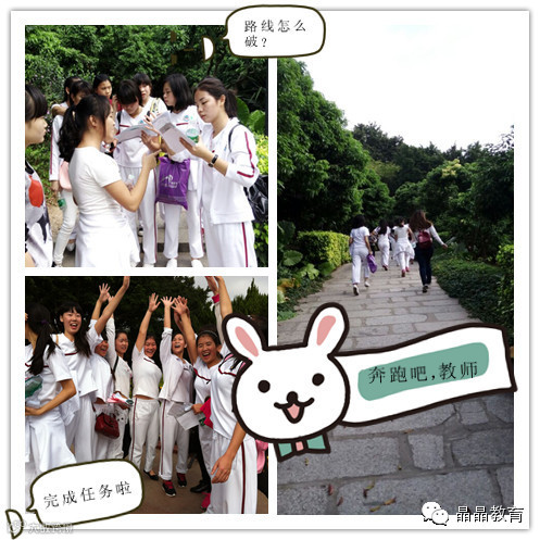 2014年11月29日上午,新秀教师分小组在莲花山公园根据手中的地图与微量线索来寻找深藏在莲花山中的任务卡,并需按要求完成任务。透过镜头,大家可以看到,在活动初,教师们对活动期盼的欣喜表情,在寻找任务卡中展现出的睿智,在执行任务中表现出的不轻易言败、坚持不懈的品质,及相当高的团队协作精神。活动的最后一项任务为:教3名幼儿唱儿歌,在此过程中,老师们展现亲和、耐心的本色,让参与互动的家长赞叹不已。