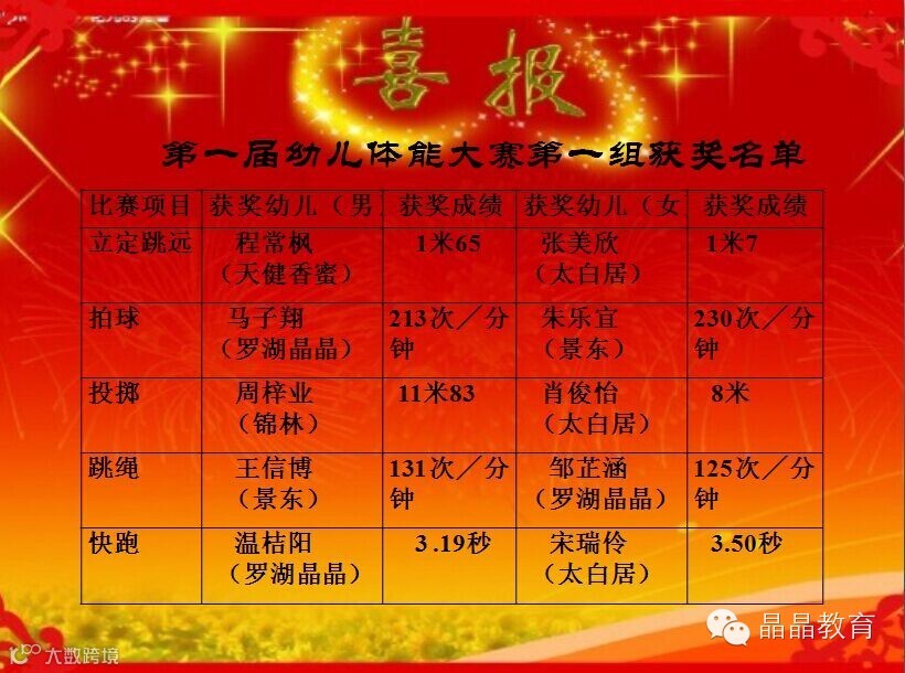 为了增强幼儿的体质,激发幼儿的运动潜能,提高幼儿平衡、协调、速度、灵敏等身体素质,增强幼儿的自信心,体验团结协作的竞赛风格,在督运中心的组织下,四场比赛活动由天健、商贸城、中海、海滨承办园的鼎力协助。今天,晶晶国际教育集团第一届体能大赛在天健香蜜幼儿园嘹亮的音乐声中拉开帷幕,参赛的选手是来自景东、天健、锦林、太白居、罗湖晶晶的健将们。