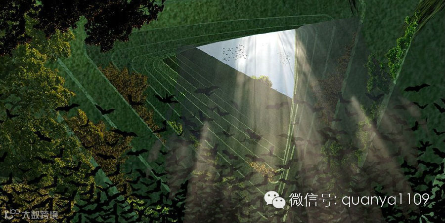内部设计一瞥,建筑顶部镂空,供阳光和雨水进入。