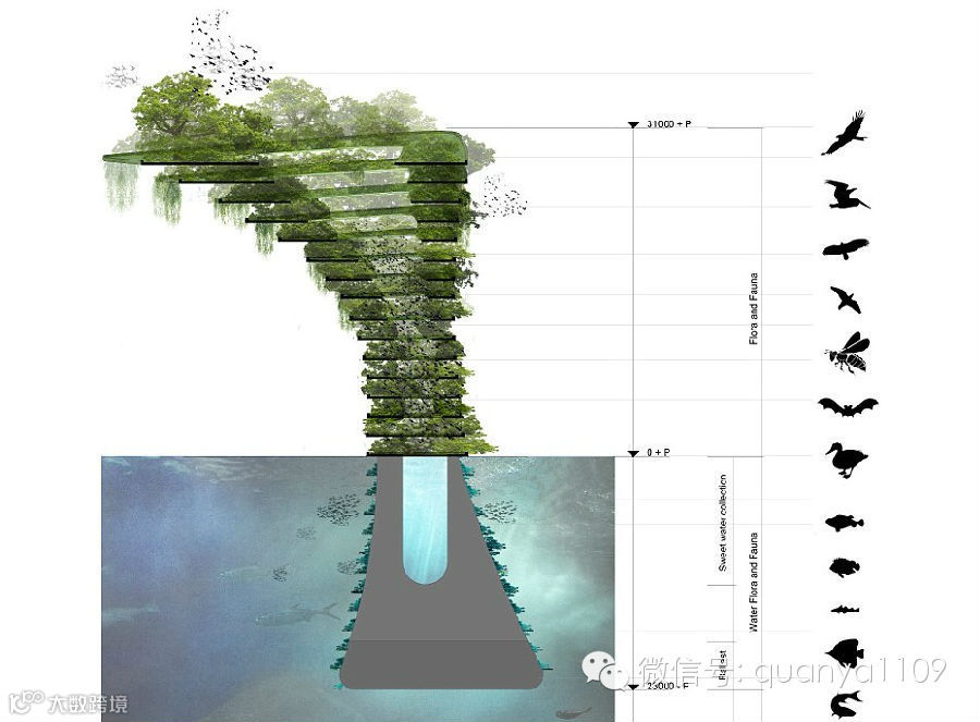 漂浮在水面以上的部分呈上大下小的火炬状,可栽培各种绿色植被,并为鸟类、蜜蜂、蝙蝠、水禽等小型动物提供一个天然的栖息地。而浸没在水面以下的部分则呈塔状,在当地气候条件允许的情况下可培育人工珊瑚礁,供小型水生生物栖息。