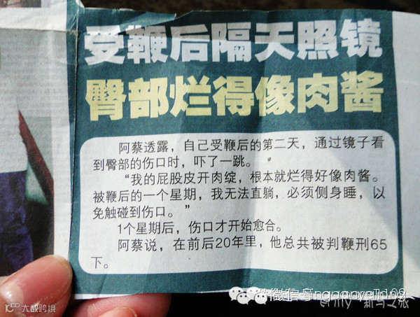 “第一鞭打下来了……难以置信的疼,而我要挨五鞭,我全身只有头发不觉得疼。我当时觉得不可能更疼了,可是第二鞭更疼了,当时我真的觉得我要给打死了。到第三鞭,打得我身子就是一团感觉到疼的肉。”