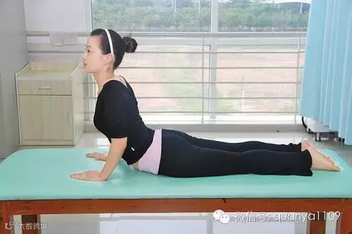 打开胸腔,放松双肩。 动作要点:俯卧在地上,两腿打开略比肩宽,脚背贴地,两臂屈肘放在胸部两侧地面。吐气时,伸直手臂,上半身抬离地面,头部向上仰起。保持30秒后,慢慢回到原位。