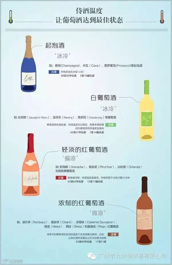 2. 白葡萄酒的理想侍酒温度在7-14℃之间。酒体越轻盈,侍酒温度越低,因此经过橡木桶的白葡萄酒的理想侍酒温度在14℃左右。