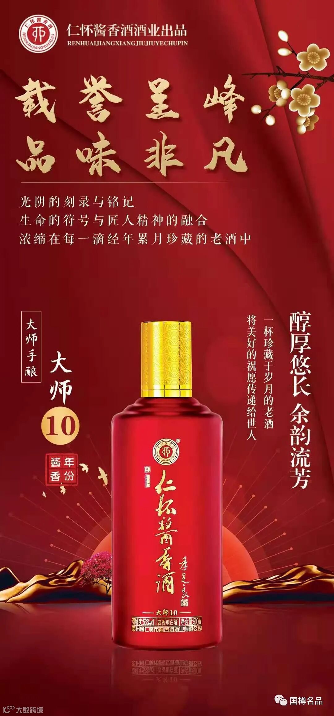 作为高端酱香酒的颜值担当,仁怀酱香酒·大师10无论是送礼,还是宴请都倍有面子。仁怀酱香酒·大师10,方寸生辉,面世即深得社会精英群体的认可!