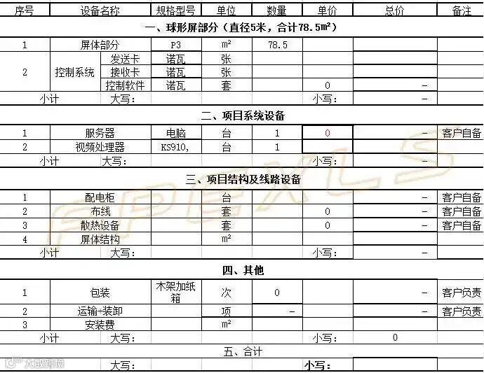 每种电子产品都有它关键的电子元器件,LED球形屏也是一样,主要的电子元器件比如:LED灯、驱动电源、控制系统、IC、视频处理器等决定于显示的质量。LED球形屏报价清单(仅供参考):