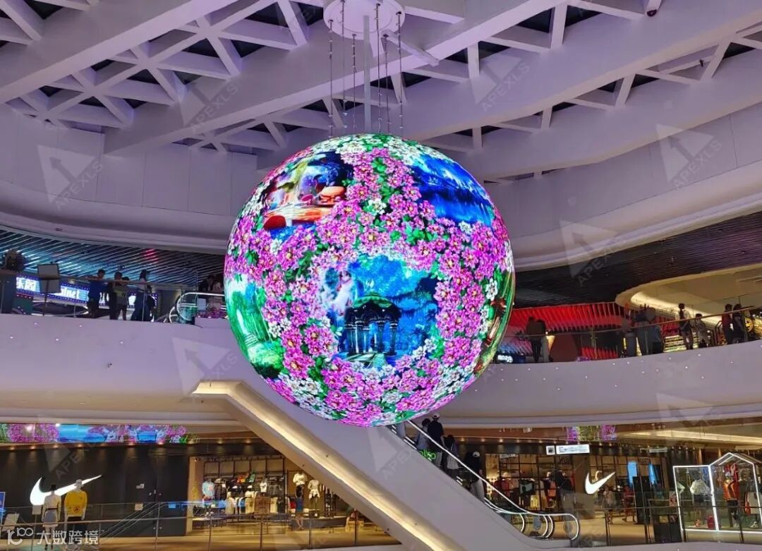佛山王府井紫薇港,这座佛山商业面积体量最大的购物中心,中庭的直径6米LED 球形屏是其独特的视觉焦点。康硕展为其注入 “生命之花” 的创意 IP,在特定时段,球形屏化身魔法容器,演绎 “生命之花” 的绽放与 “花雨飘落” 的浪漫场景。高精度的视觉悬浮科技,让虚拟花瓣仿佛真实飘落,远看又如繁星闪烁。配合精心设计的声光效果,整个购物中心中庭瞬间化作光影艺术空间,消费者穿梭其中,仿佛漫步在梦幻花园,极大提升了购物体验的趣味性与沉浸感,成为商场吸引客流、提升商业价值的重要利器。