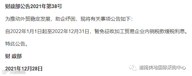 2021年12月21日,国务院常务会议确定跨周期调节措施,推动外贸稳定发展。为落实国务院常务会议精神,财政部印发《关于2022年暂免征收加工贸易企业内销税款缓税利息的公告》,明确自2022年1月1日起至2022年12月31日,暂免征收加工贸易企业内销税款缓税利息。