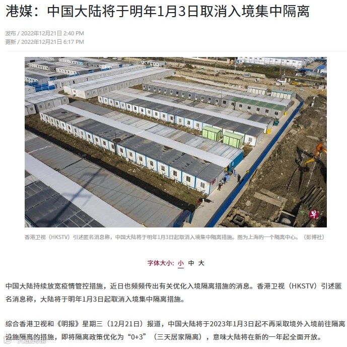 随着各地入境防疫政策的一再放松,今日,中国香港媒体香港卫视和《明报》也再次曝出,从明年的1月3日开始,中国将全面开放入境政策,将目前还在施行的隔离政策优化为“0+3”,所谓的“0+3”是指海外人员在入境时将无需再在酒店进行集中隔离,只需要在自宅隔离3天就好。
