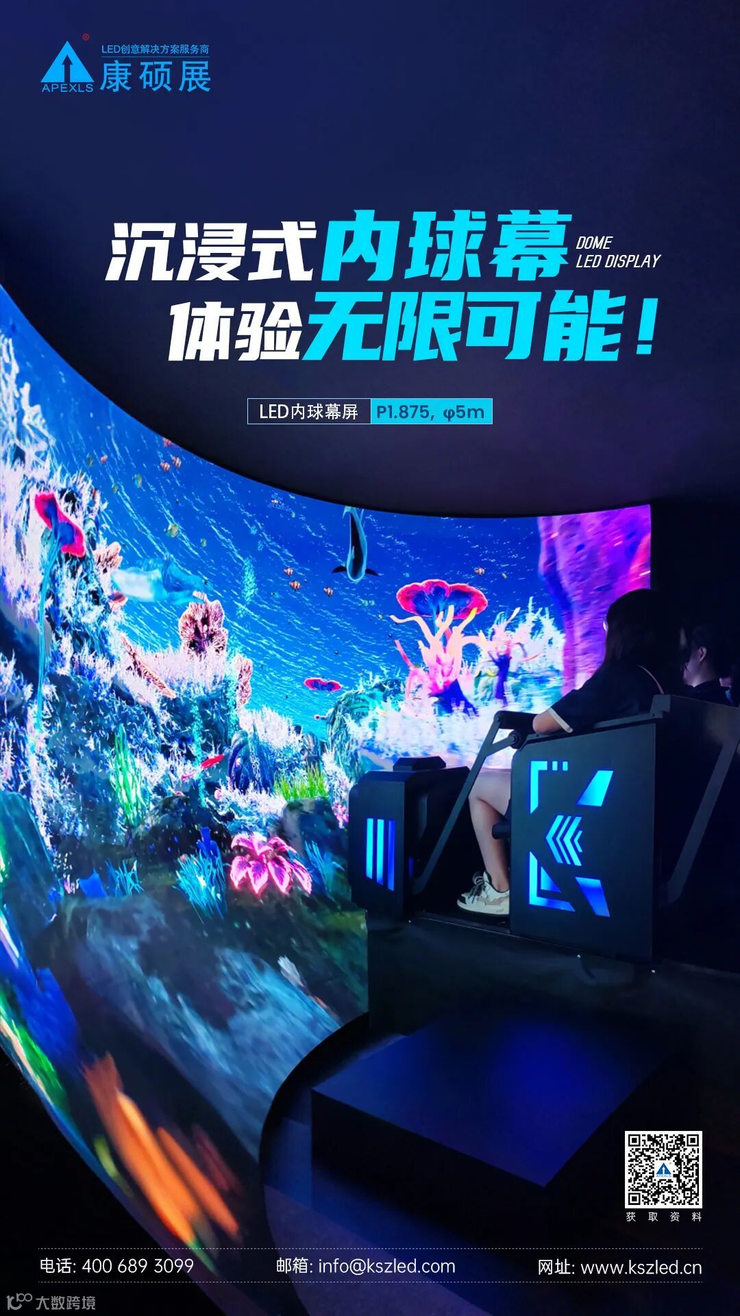 康硕展2015年研发出世界第一片7.2米内球幕,拥有行业领先的专利技术及设计方案。康硕展沉浸式LED球幕解决方案:包括项目创意设计、结构设计与施工、LED模块定制、控制系统和软件、创意主题内容、功能定制等。