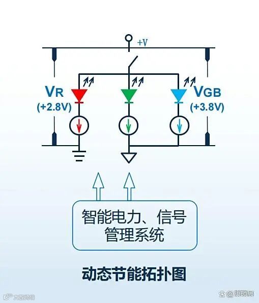 1. 采用智能电力系统设计,运用“动态”的分配红、绿蓝的精准驱动电压,使得红管上获得2.8V的电压,蓝绿管上获得3.8V的电压。这种精准供电方式有效避免了多余电压损耗,大幅降低了功耗。