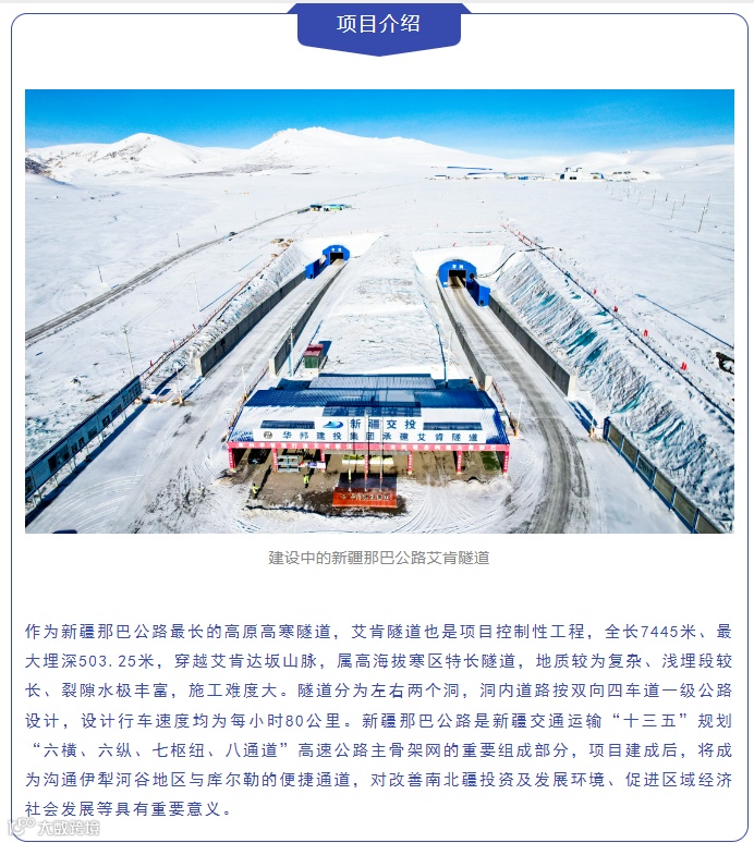 当日,艾肯达坂冰天雪地,气温低至 -42℃,而隧道内灯火通明,气温在15℃,工人们分布在各个定点紧张有序作业,施工车辆穿梭往来,呈现出一片热火朝天的景象。华邦建投集团承建的那巴公路5标项目全长8.059公里,桥隧比高达93.7%,其中艾肯隧道左洞长7445米,右洞长7405米,斜井长1180米,采用钻爆法施工。该隧道地处和静县境内海拔2640米的天山艾肯达坂,最低温度零下四十多摄氏度,冰雪期长达8个月,自然环境恶劣。隧道穿越三条断裂带,不良地质总长1355米,占总洞长的18.3%,具有地质复杂、单向纵坡、高寒高海拔、渗水量大等施工难点。