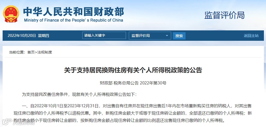 财政部税务总局发布《关于支持居民换购住房有关个人所得税政策的公告》。今年10月1日至2023年12月31日,对出售自有住房、并在现住房出售后1年内在市场重新购买住房的纳税人,对其出售现住房已缴纳的个人所得税予以退税优惠。