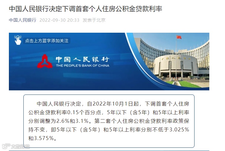 中国人民银行发布一则公告,备受关注的公积金贷款利率终于迎来了七年来的首次下调。自2022年10月1日起,下调首套个人住房公积金贷款利率0.15个百分点,5年以下(含5年)和5年以上利率分别调整为2.6%和3.1%。第二套个人住房公积金贷款利率政策保持不变,即5年以下(含5年)和5年以上利率分别不低于3.025%和2.575%。