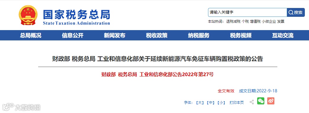 国税总局发布《关于延续新能源汽车免征车辆购置税政策的公告》。自2022年10月1日起,对已备案汽车销售企业从自然人处购进二手车的,允许企业反向开具二手车销售统一发票并凭此办理转移登记手续。
