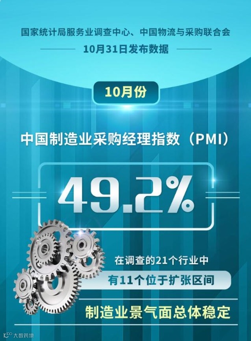 10月份中国制造业采购经理指数为49.2%,较上月下降0.9个百分点,在连续两个月环比上升后再次下降,显示指数走势有所波动,经济恢复势头仍需进一步稳固。从行业来看,调查的21个行业中,有11个位于扩张区间,制造业景气面总体稳定。