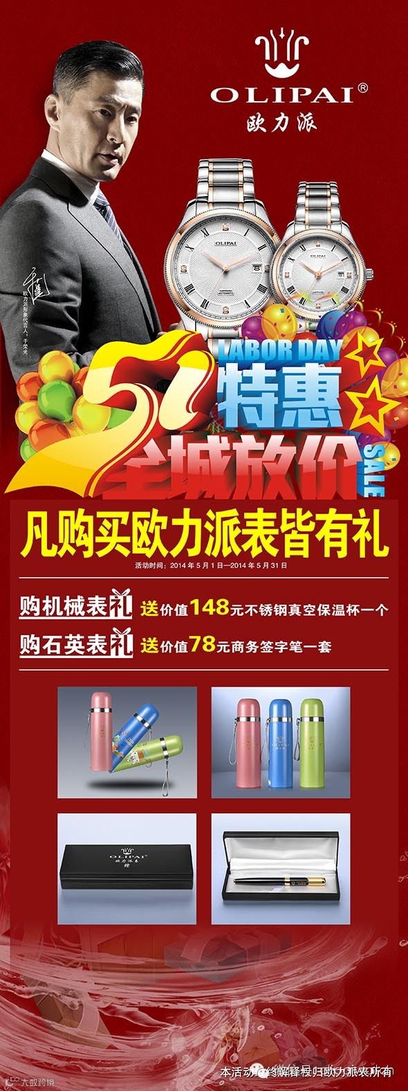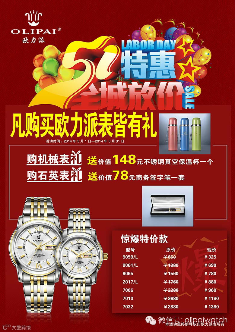 凡购买欧力派品牌机械表 送价值148元不绣钢真空保温杯一个