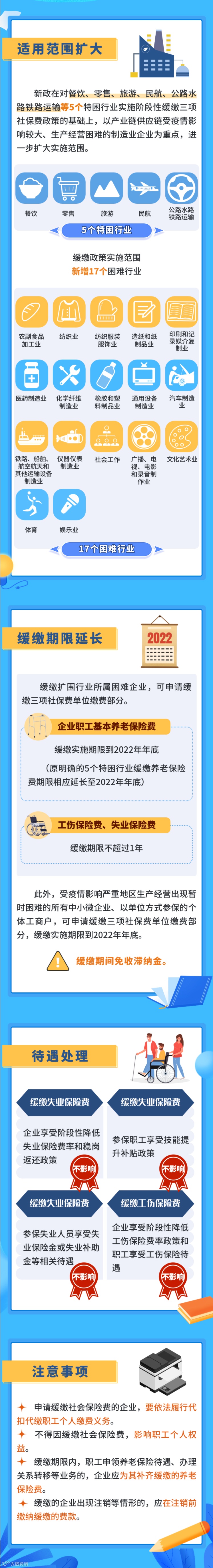 费政策实施范围,在餐饮、零售、旅游、民航、公路水路铁路运输等5个特困行业基础上,再增加汽车制造业、通用设备制造业等17个困难行业。