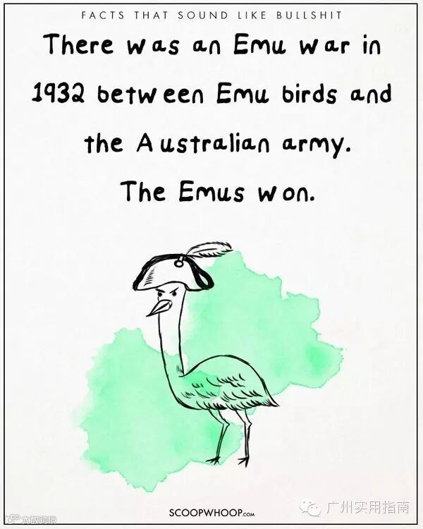 2.1932 年澳洲的鸸鹋 (Emu,中文读作‘而苗’) 与军队之间曾发生过一场“鸸鹋战争”,最后鸸鹋赢了。