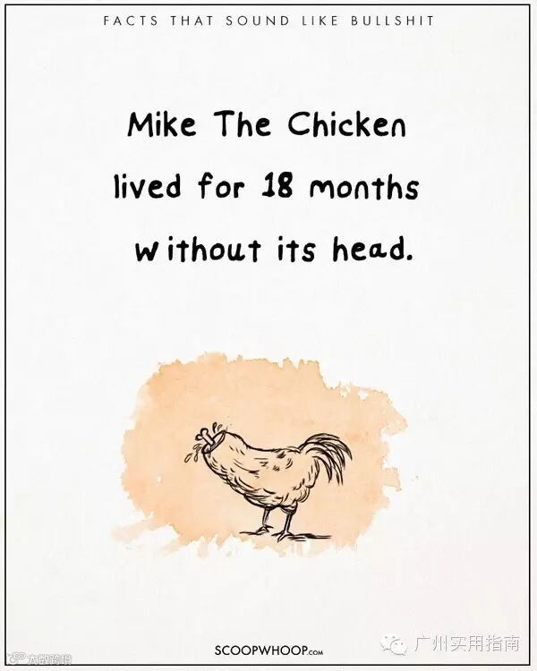1.无头鸡麦克在失去牠的头之后,又活了18个月。