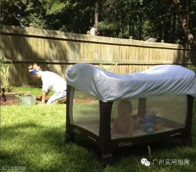 在婴儿床上加个床单,防止虫虫入侵和晒伤