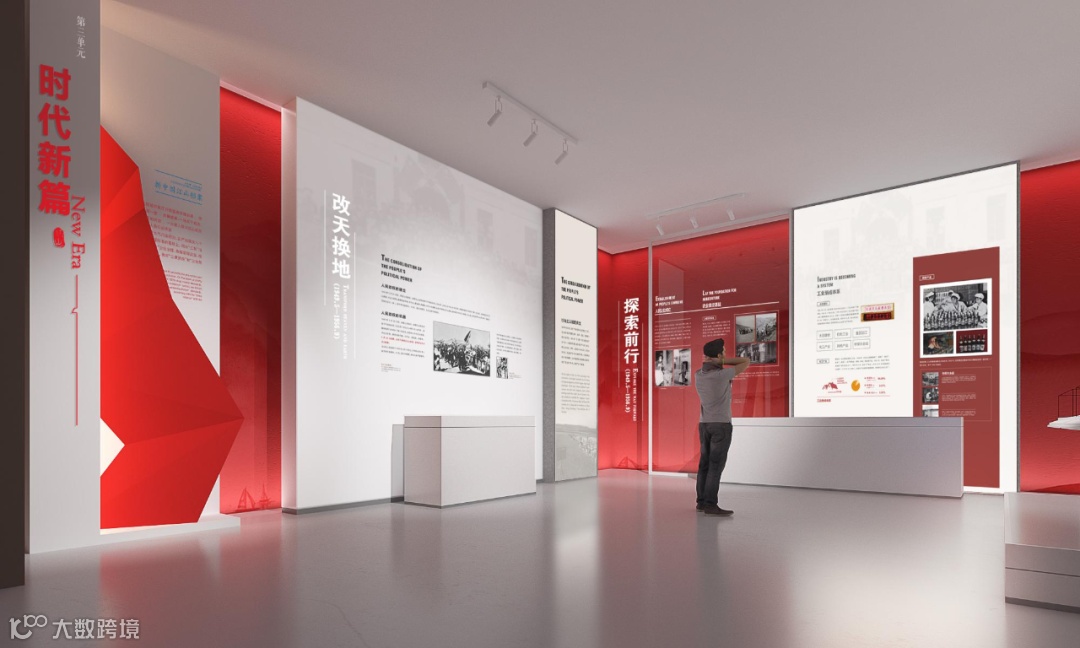 以奋进红为主色调,以色调的变化、顶天立地的展墙设计,突出时代的更迭与进步,见证江山自建国以来奋进拼搏、赶超跨越的壮丽征程。