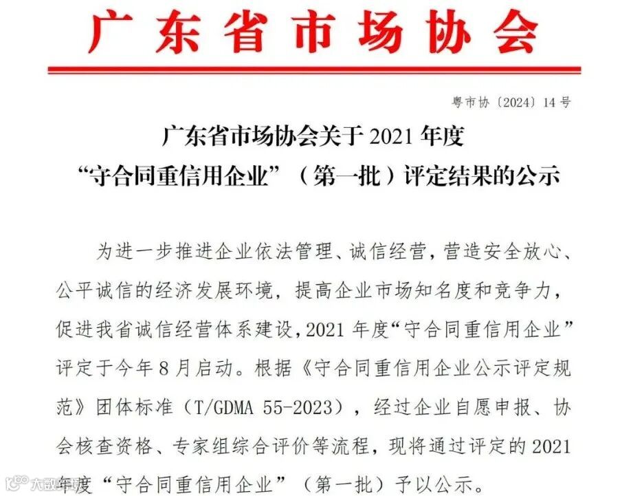 “守合同重信用企业”评选是广东省市场监督管理局批准的一项高规格企业评选。通过对企业综合素质、品牌影响力、企业管理水平、社会信誉、合同履约管理等多方面进行综合评定,并评选出诚信经营、信用体系建设和合同制度管理完善的优秀企业,予以公示和表彰。